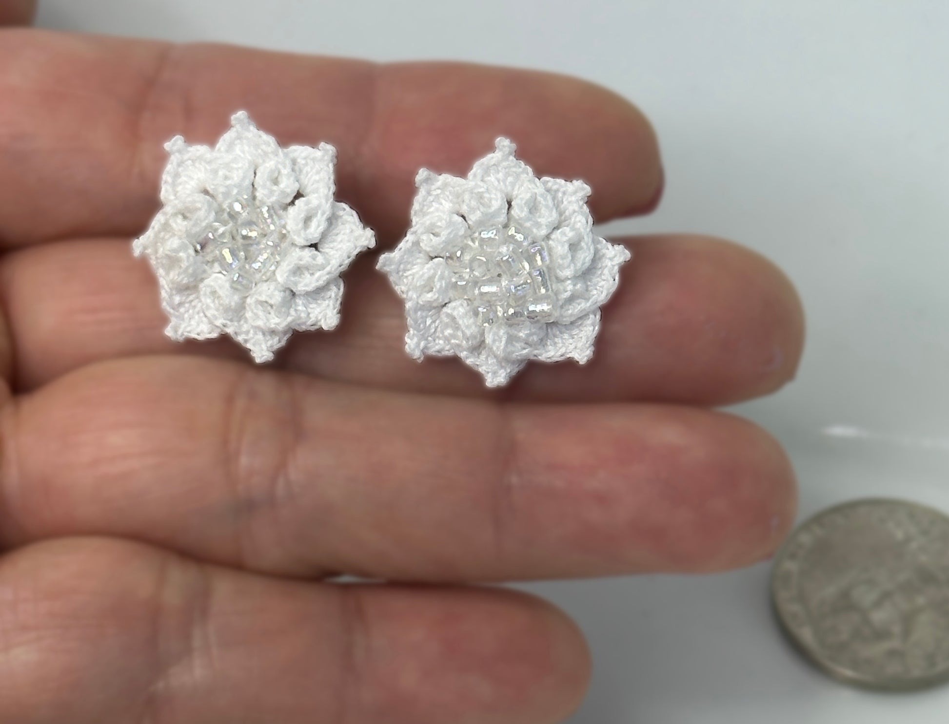 Delicately handcrafted with fine lace thread, these tiny crochet flower earrings showcase the beauty of micro crochet art. Each petal is skillfully shaped and accented with shimmering seed beads at the center, creating a subtle sparkle that catches the light.