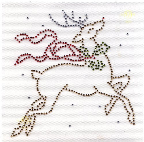Beautiful and Easy to Apply IRON ON RHINESTONES Reindeer ss6 Clear , Red , gold and green Rhinestones. Can be applied with household iron or commercial heat press. Approx Size 5.5" x 5.5"