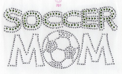 Beautiful and Easy to Apply IRON ON RHINESTONES Soccer MOM ss6 and ss 10 clear and green Rhinestones. Can be applied with household iron or commercial heat press. Approx Size 7.5" x 4"